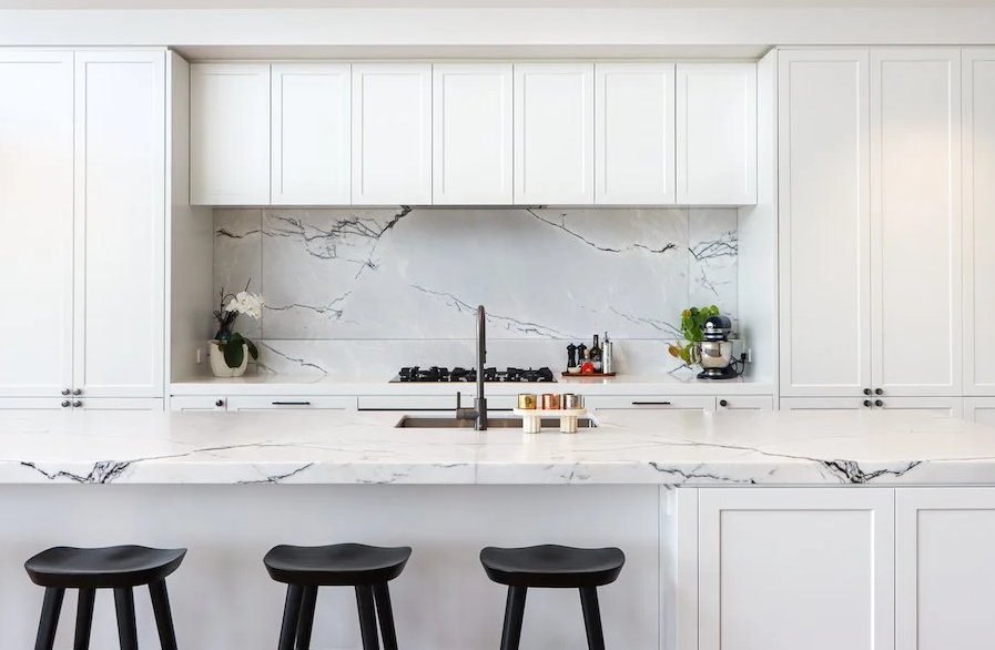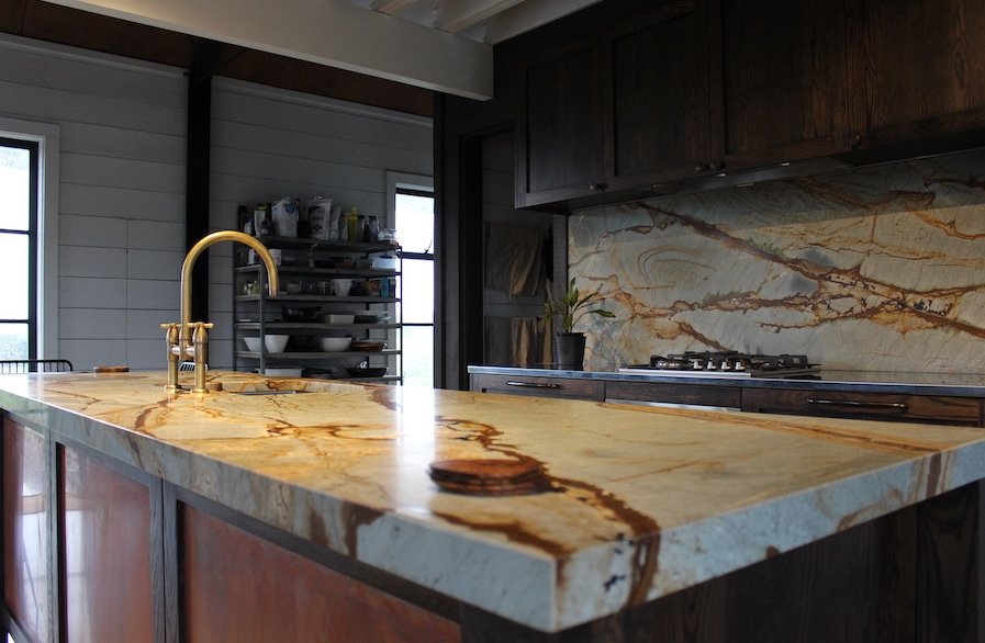 The Taj Mahal quartzite benchtops are continued through to the scullery with the dark Oak veneer cabinetry and to the bespoke bar cabinetry in the dining area. The breath-taking Blue Tempest splashback adorns the bar cabinetry while elegant onyx light fixtures provide a warm, inviting glow.